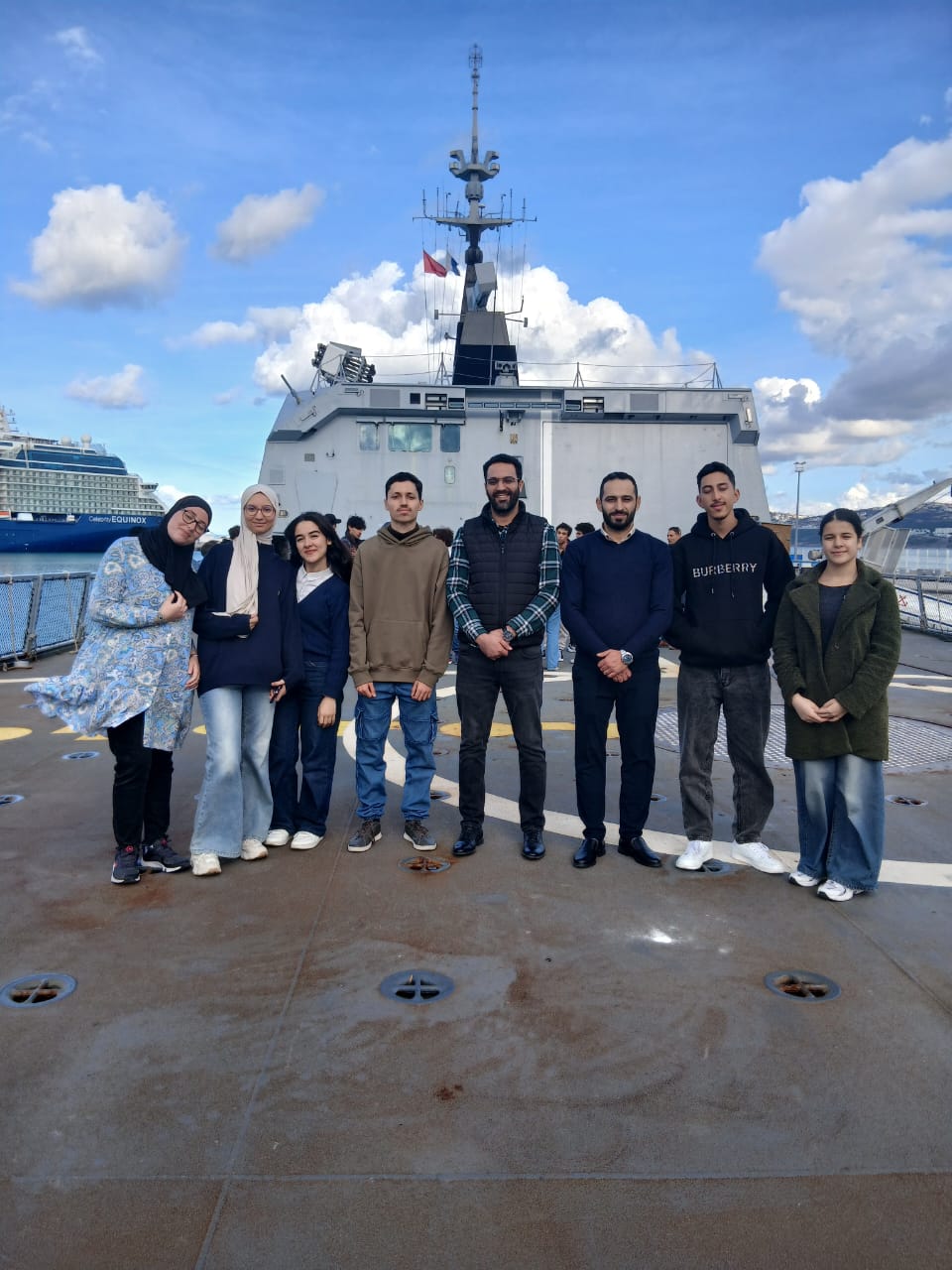 Dans le cadre du renforcement des relations académiques et culturelles, un groupe de six étudiants de l’École Supérieure de Technologie, accompagnés de leurs enseignants M. El Mehdi El Bahloul et M. El Hammoumi Aboubakr, a eu l’honneur de visiter la frégate française en escale au port de Tanger.